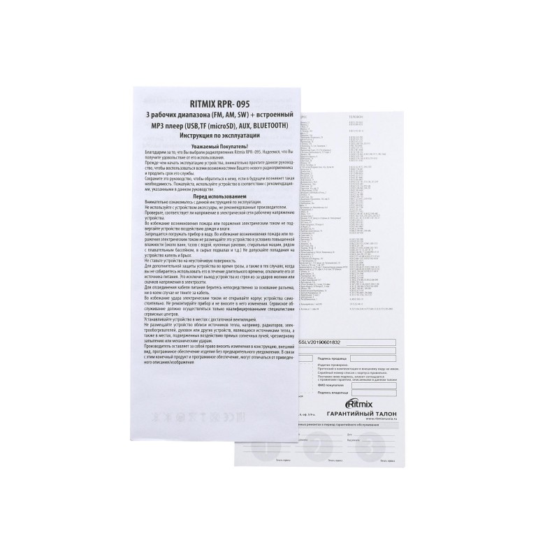 Название продукта - Radio Ritmix RPR-095, FM/AM/SW, BT/USB/mSD/AUX, 220V/Accu/2D, Silver